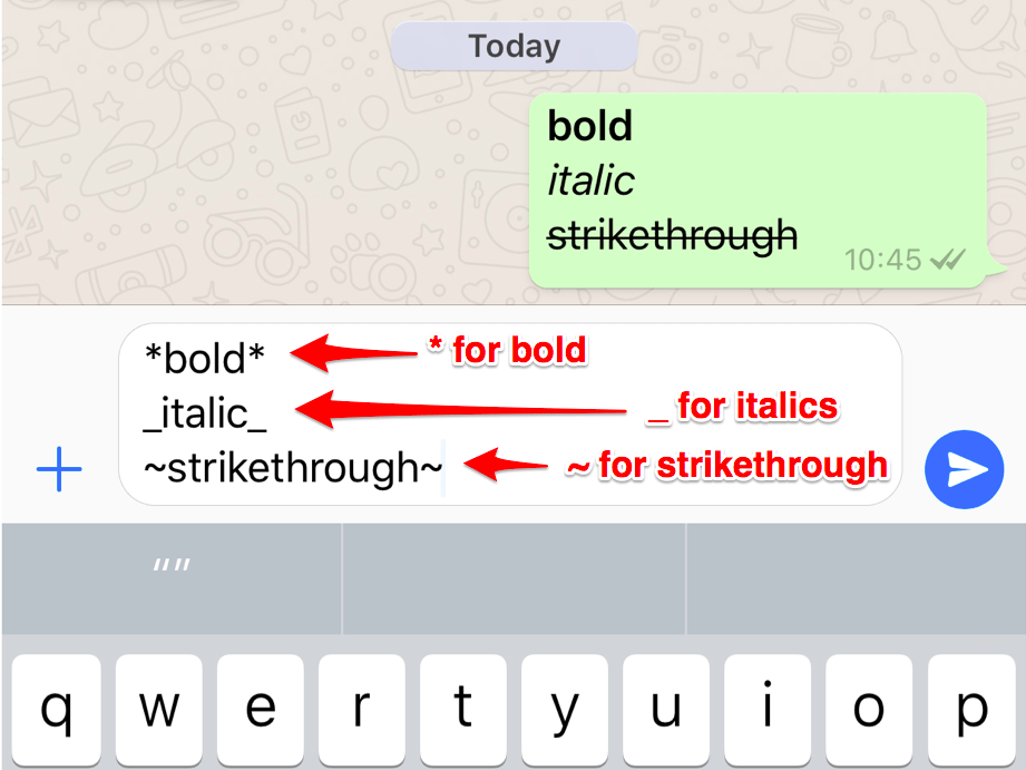 Aug 15, 2017 · unless you're a whatsapp pro user, you may be surprised to know that there are text formatting options that you can apply to your messages. One way you can customize your messages is by using certain commands. You can do this for a single word or a longer text. Mar 26, 2021 · to type in bold, insert an asterisk (star *) at the beginning and the end of a word, sentence, or paragraph. Jul 02, 2021 · for example, type ```name``` to monospace the word name.